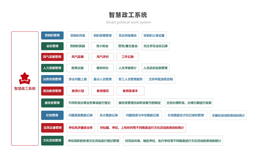 包含控制臺(tái)、組織架構(gòu)、黨建動(dòng)態(tài)、黨員學(xué)習(xí)、組織活動(dòng)、志愿服務(wù)、黨費(fèi)管理、監(jiān)督執(zhí)紀(jì)功能模塊。通過(guò)黨建在線學(xué)習(xí)教育,解決黨建學(xué)習(xí)難問(wèn)題,實(shí)現(xiàn)便捷化管理;黨務(wù)工作流程及黨建資訊全掌握、黨建工作全方位可視,統(tǒng)一數(shù)據(jù)標(biāo)準(zhǔn),智能分析績(jī)效考評(píng),成績(jī)一目了然,做到數(shù)據(jù)指標(biāo)化;積極推進(jìn)黨建工作高效完成,信息高效處理。