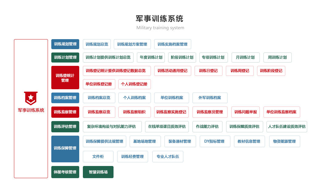 包括訓(xùn)練計(jì)劃、訓(xùn)練檢查、訓(xùn)練考核、訓(xùn)練檔案、訓(xùn)練資源模塊,實(shí)現(xiàn)對(duì)訓(xùn)練計(jì)劃制定情況自動(dòng)統(tǒng)計(jì)和智能分析、逐步解決訓(xùn)練時(shí)間、訓(xùn)練人員落實(shí)情況、實(shí)現(xiàn)智能報(bào)靶和體能訓(xùn)練監(jiān)測(cè)、實(shí)現(xiàn)網(wǎng)上模擬訓(xùn)練與考核的智能化、自動(dòng)化和便捷化,對(duì)訓(xùn)練資源科學(xué)管理,確保為軍事訓(xùn)練工作有力支撐。