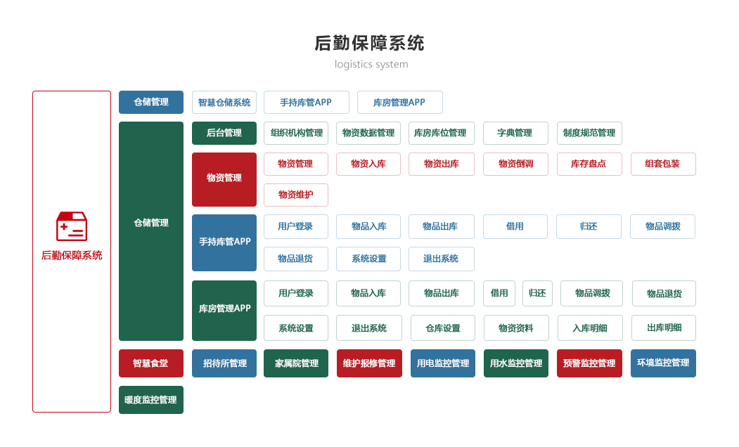 綜合保障系統(tǒng)依托物聯(lián)網(wǎng)、RFID識(shí)別和傳感技術(shù),著眼作戰(zhàn)精準(zhǔn)保障、戰(zhàn)備常態(tài)保障和官兵生活保障,對(duì)戰(zhàn)備物資、裝備器材、營(yíng)房物資和被裝物資等的全生命周期的電子化管理,對(duì)官兵的健康實(shí)時(shí)監(jiān)護(hù)。包含財(cái)務(wù)管理、軍需油運(yùn)、武器裝備、衛(wèi)勤管理、營(yíng)房管理模塊。確保部隊(duì)出動(dòng),車輛給養(yǎng)油料跟得上,裝備維護(hù)情況實(shí)時(shí)掌握,營(yíng)房管理工作平時(shí)與戰(zhàn)備同步推進(jìn)。